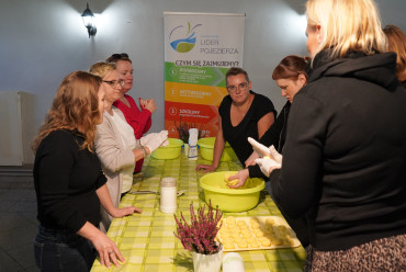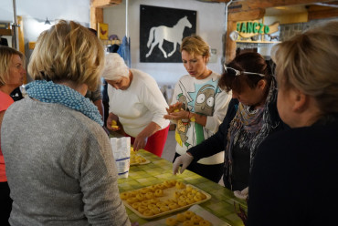 Tradycyjny śląski obiad na „Ranczo”? Zdecydowanie tak! A zatem w menu pojawiły się kluski śląskie. Jednak, aby uczestnicy wizyty studyjnej mogli je zjeść, musieli najpierw sami je sobie przygotować. Warsztaty z lepienia klusek odbyły się pod czujnym okiem Pani Danuty Wapińskiej, a powstałe podczas nich wyroby stanowiły później dodatek do wspólnego obiadu.