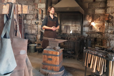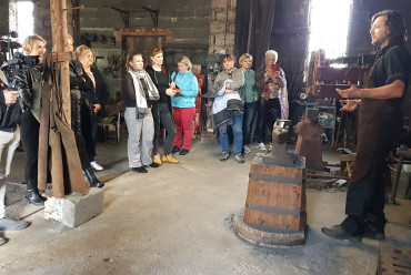 Następnie rozśpiewana grupa z pięknych wnętrz pałacowych udała się na tzw. Słupiska do kuźni Pana Janusza Kosmały. Wśród licznych odgłosów kucia i iskier ognia poznali tajniki pracy artystycznej w kuźni oraz odkryli czym jest „pocałunek kowala”. Zaintrygowanych ciekawostką zapraszamy na nasz kanał na YouTube, gdzie już wkrótce pojawi się film z wizyty studyjnej.