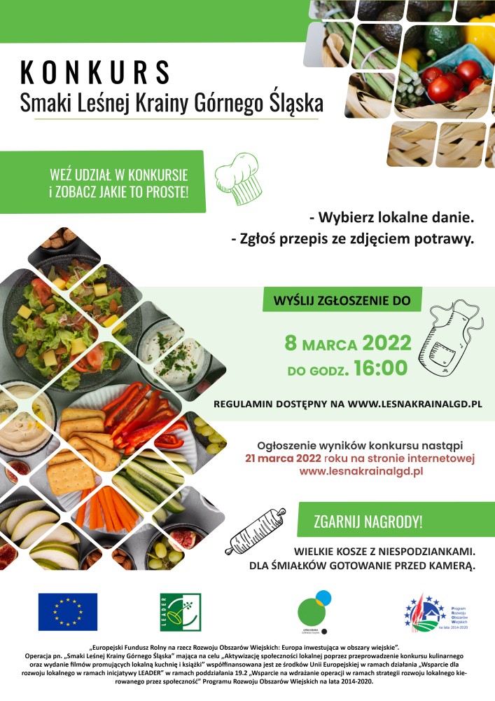 Stowarzyszenie Lokalna Grupa Działania „Leśna Kraina Górnego Śląska” zaprasza wszystkich restauratorów, organizacje tj. KGW i stowarzyszenia oraz mieszkańców będących miłośnikami lokalnej kuchni z obszaru Stowarzyszenia LGD „Leśna Kraina Górnego Śląska” do wzięcia udziału w konkursie „Smaki Leśnej Krainy Górnego Śląska”.