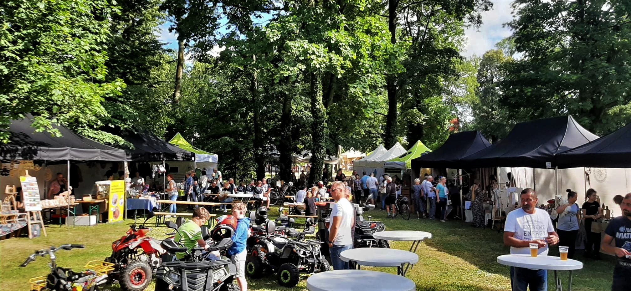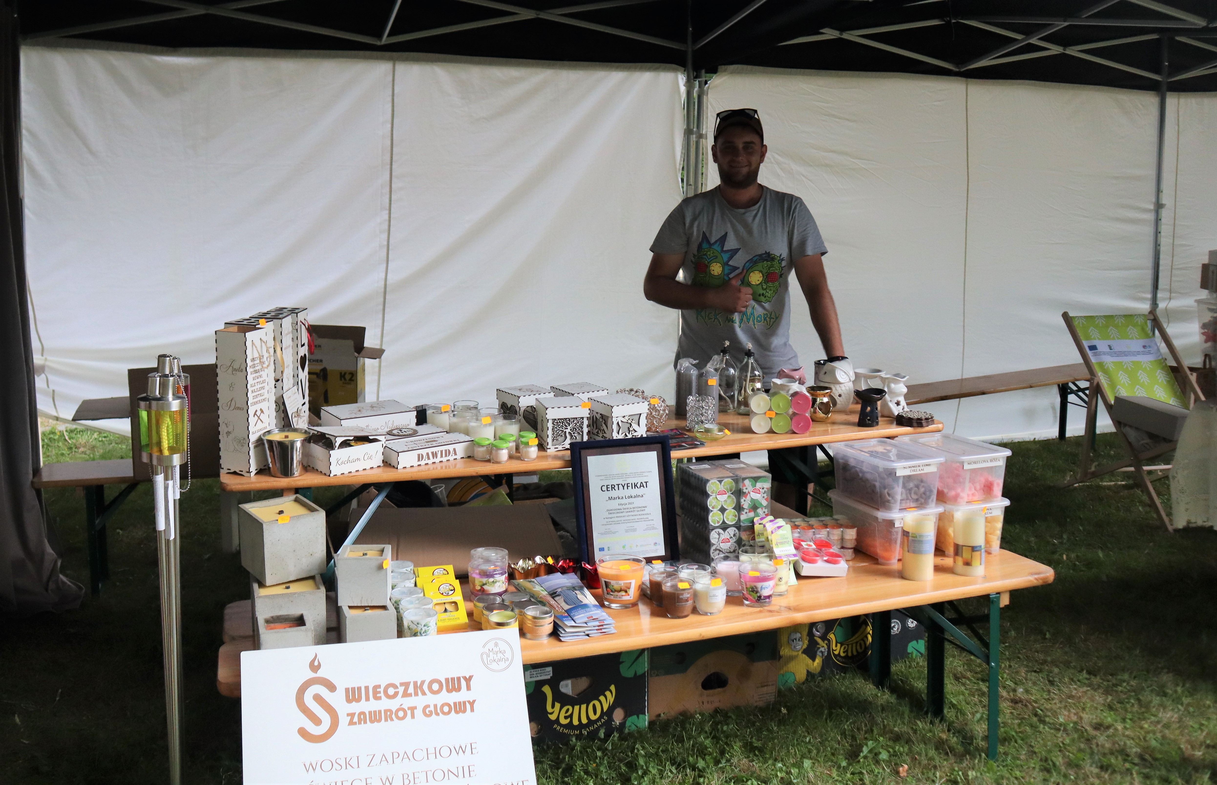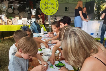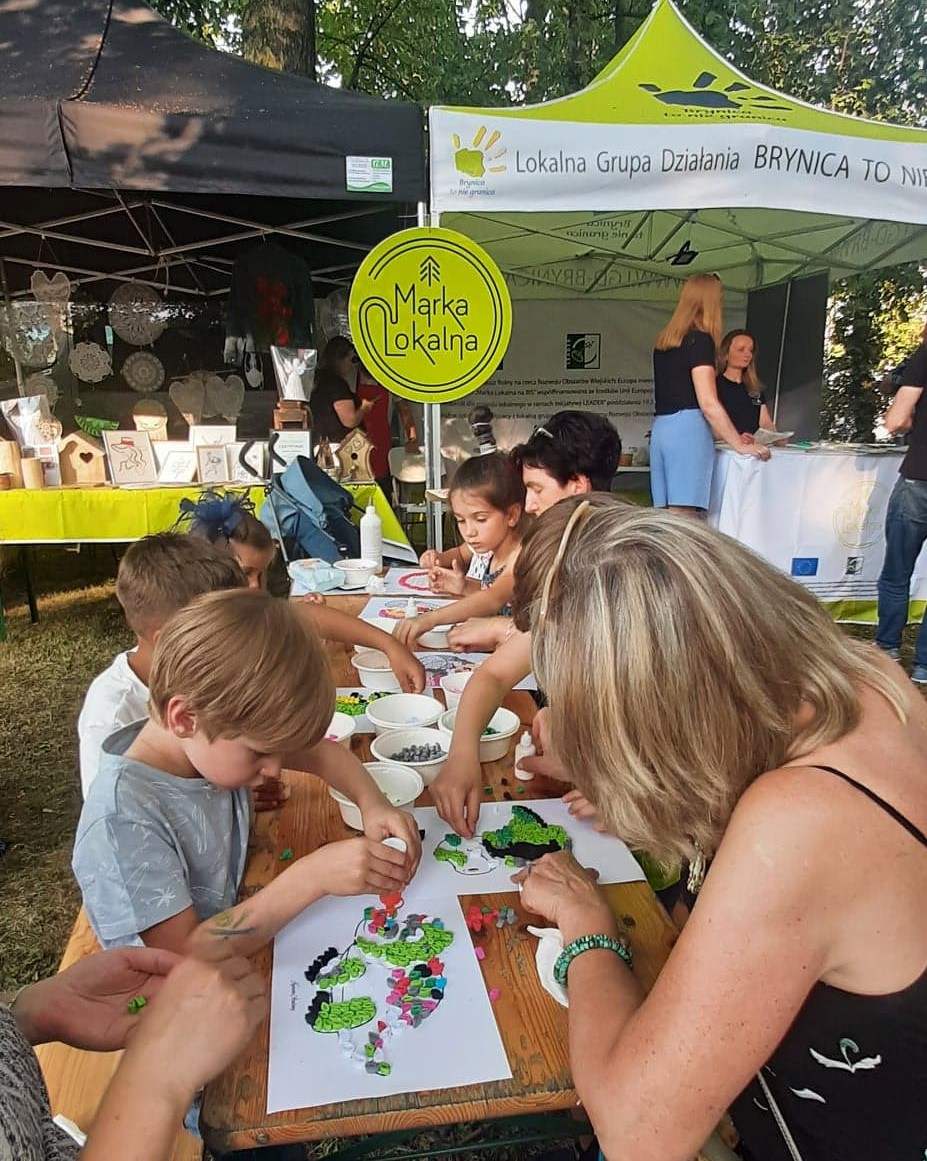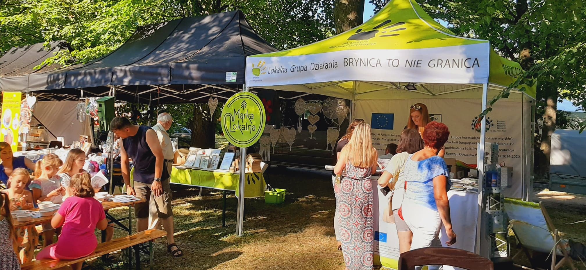 Nieopodal głównej sceny i zaplecza gastronomicznego powstało niemal miasteczko twórców nagrodzonych tytułem „Marka Lokalna”. Dwa rzędy namiotów wystawowych z naszego terenu, a także z obszaru działania Stowarzyszenia LGD „Brynica to nie granica” oraz LGD Nadarzyn-Raszyn-Michałowice. Rzemieślnicy i artyści mieli niebywałą okazję zaprezentowania i sprzedaży swoich wyrobów: biżuterii, obrazów, galanterii skórzanej i tekstylnej, produktów z drewna i szkła. Pomiędzy rzędami wystawców znalazło się miejsce dla naszego beneficjenta, firmy Off-Road. Dzięki niemu każdy mógł zasiąść za kierownicą quada, nawet Ci najmniejsi. Jednak frajdę miały nie tylko dzieci, ale również dorośli. W miasteczku Marki Lokalnej swoje pokazy prowadził między innymi kowal Pan Piotr Farbowski, a warsztaty dla dzieci prowadzone były przez cały czas trwania jarmarku. Można było spróbować swoich sił w pracach plastycznych z różnymi materiałami jak papier, krepa a nawet szkło. Te ostatnie prowadzone były przez Panią Sylwię Pietrek z firmy Witrażowy upominek.