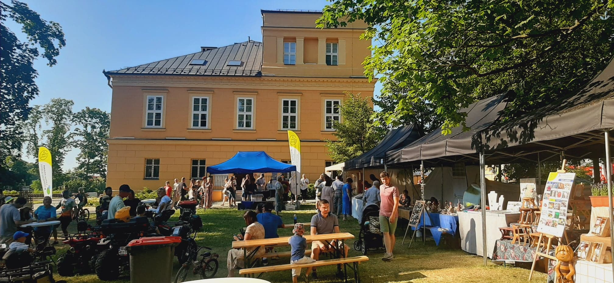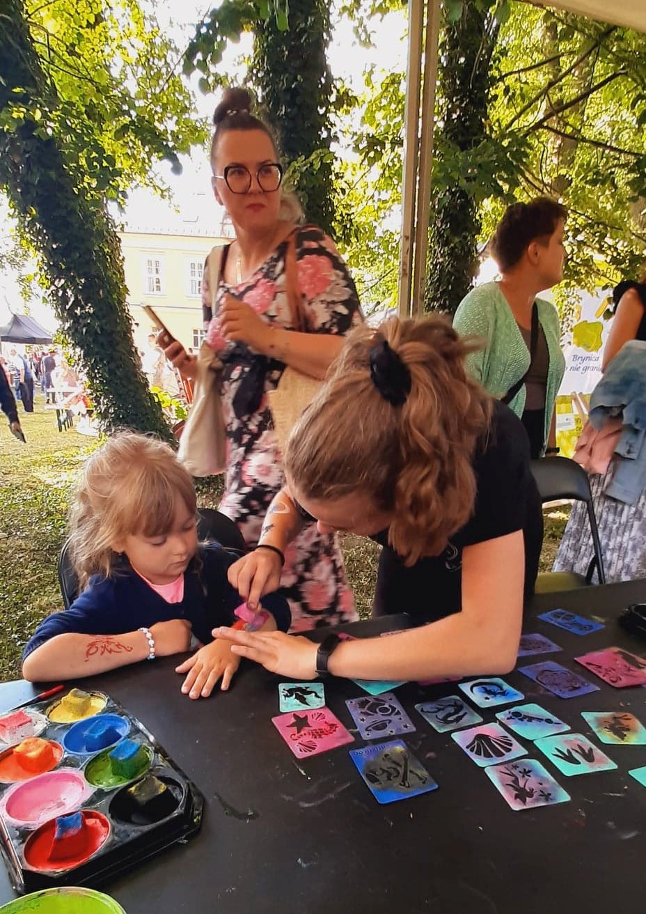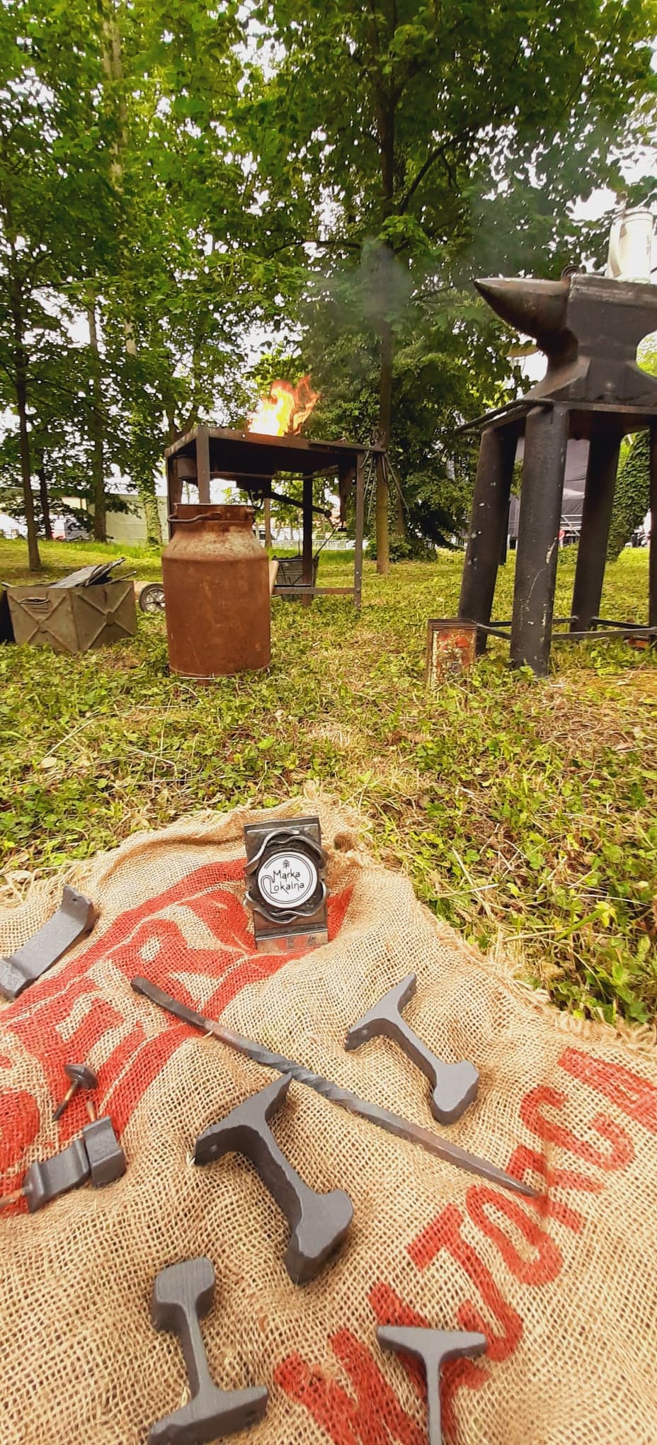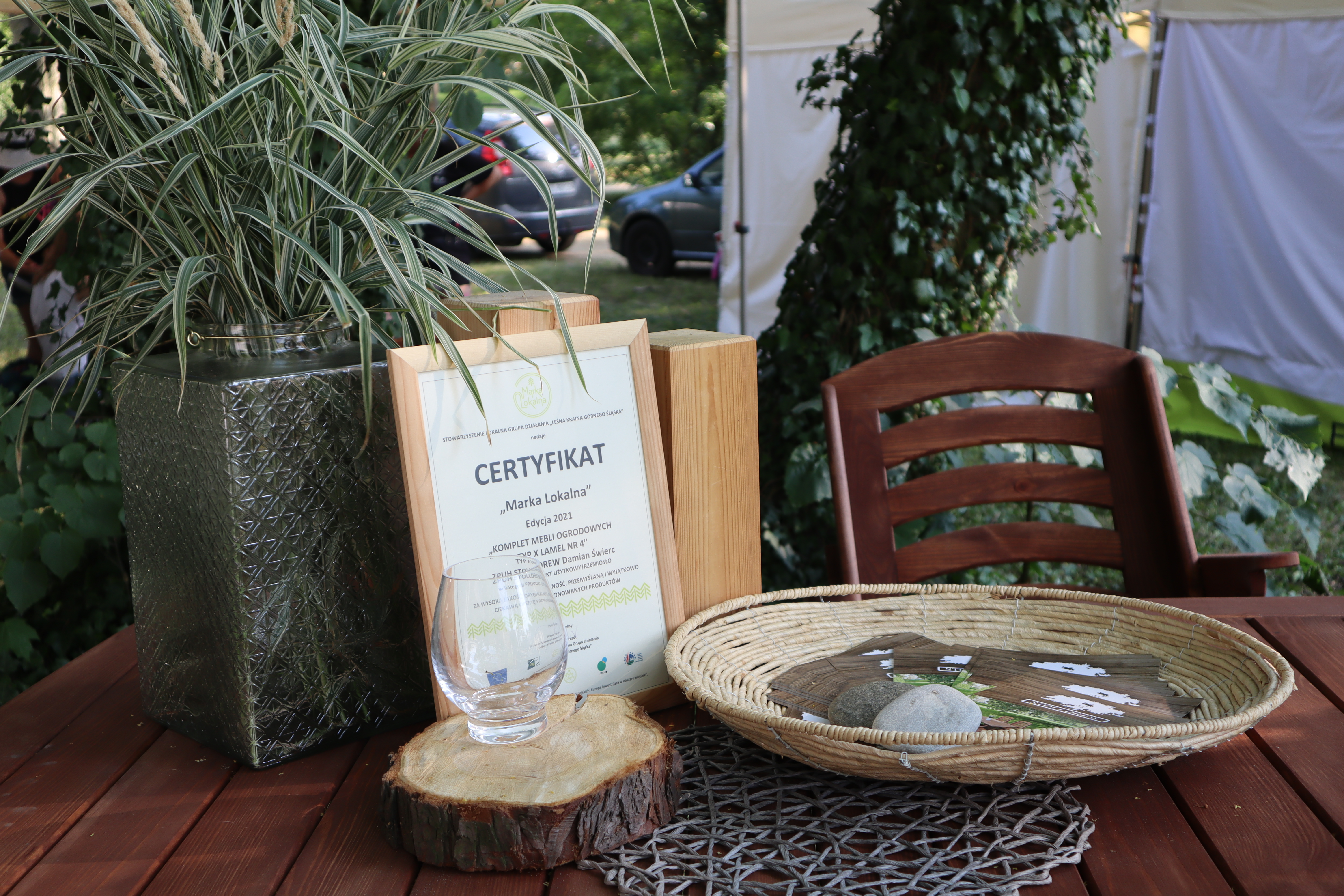 Nieopodal głównej sceny i zaplecza gastronomicznego powstało niemal miasteczko twórców nagrodzonych tytułem „Marka Lokalna”. Dwa rzędy namiotów wystawowych z naszego terenu, a także z obszaru działania Stowarzyszenia LGD „Brynica to nie granica” oraz LGD Nadarzyn-Raszyn-Michałowice. Rzemieślnicy i artyści mieli niebywałą okazję zaprezentowania i sprzedaży swoich wyrobów: biżuterii, obrazów, galanterii skórzanej i tekstylnej, produktów z drewna i szkła. Pomiędzy rzędami wystawców znalazło się miejsce dla naszego beneficjenta, firmy Off-Road. Dzięki niemu każdy mógł zasiąść za kierownicą quada, nawet Ci najmniejsi. Jednak frajdę miały nie tylko dzieci, ale również dorośli. W miasteczku Marki Lokalnej swoje pokazy prowadził między innymi kowal Pan Piotr Farbowski, a warsztaty dla dzieci prowadzone były przez cały czas trwania jarmarku. Można było spróbować swoich sił w pracach plastycznych z różnymi materiałami jak papier, krepa a nawet szkło. Te ostatnie prowadzone były przez Panią Sylwię Pietrek z firmy Witrażowy upominek.
