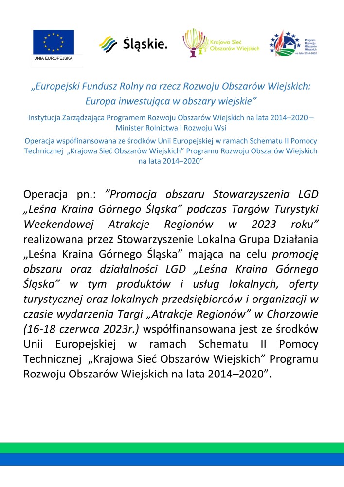 Operacja pn. "Promocja obszaru Stowarzyszenia LGD „Leśna Kraina Górnego Śląska” podczas Targów Turystyki Weekendowej Atrakcje Regionów w 2023 roku" są to działania, które będą promować atrakcje turystyczne oraz produkty lokalne z terenu 16 gmin województwa śląskiego tworzących obszar LGD "Leśna Kraina Górnego Śląska” tj.: Ciasna, Pawonków, Kochanowice, Herby, Koszęcin, Kalety, Miasteczko Śląskie, Tworóg, Krupski Młyn, Sośnicowice, Wielowieś, Toszek, Rudziniec, Pyskowice, Pilchowice i Zbrosławice. Głównym zadaniem będzie zorganizowanie stanowiska wystawienniczego Stowarzyszenia LGD „Leśna Kraina Górnego Śląska” podczas XI edycji Targów "Atrakcje Regionów" w Parku Śląskim w Chorzowie w dniach 16-18 czerwca 2023 roku.