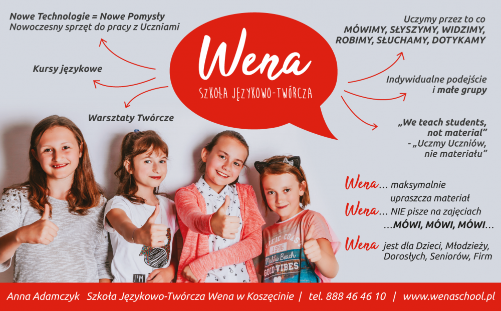 Wszystkich zainteresowanych ofertą zajęć Szkoły Językowo-Twórczej "Wena” zapraszamy na stronę internetową http://wenaschool.pl/