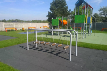 oraz elementy wyposażenia: kosze na śmieci (2 szt.), ławki z oparciem (5 szt.), regulamin placu zabaw. Wokół urządzeń zabawowych została położona nie tylko nawierzchnia trawiasta ale przede wszystkich nawierzchnia bezpieczna z płyt gumowych EPDM, co dodatkowo wpływa na bezpieczeństwo użytkowników.
